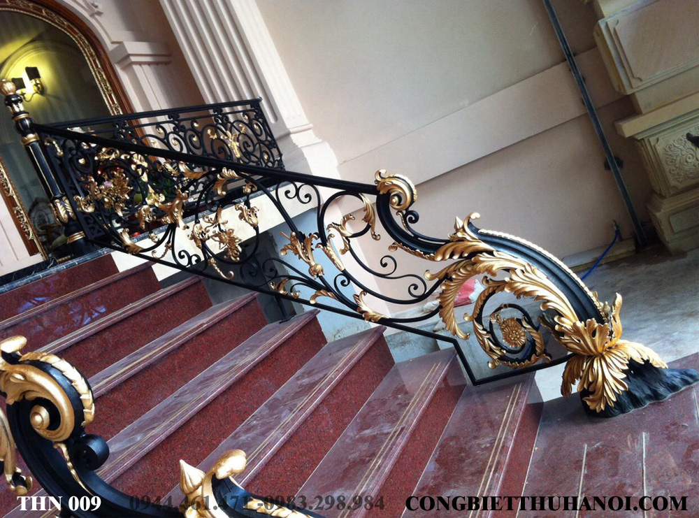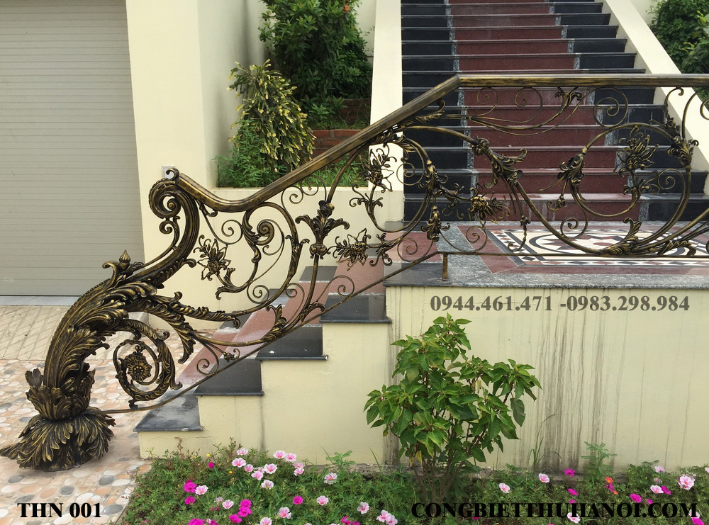 Mẫu cầu thang cong THN 001 được đúc bằng hợp kim nhôm, hoặc đúc hoàn toàn bằng hợp kim đồng ( cầu thang đồng đúc), sơn giả cổ đồng vàng, lắp đặt hoàn thiện tại công trình.