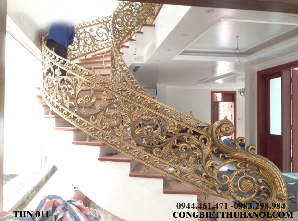 Mẫu cầu thang cong THN 011 được đúc bằng hợp kim nhôm, hoặc đúc hoàn toàn bằng hợp kim đồng ( cầu thang đồng đúc), sơn giả cổ đồng vàng, lắp đặt hoàn thiện tại công trình.
