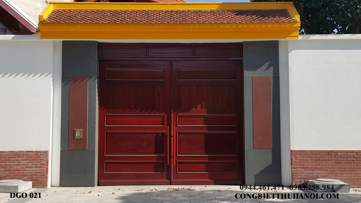 Để bảo vệ cánh cổng gia chủ thường hay đổ mái hoặc làm mái gỗ lợp ngói bảo vệ cánh cổng. Trụ cổng và mái cổng được làm bằng gỗ lợp ngói.